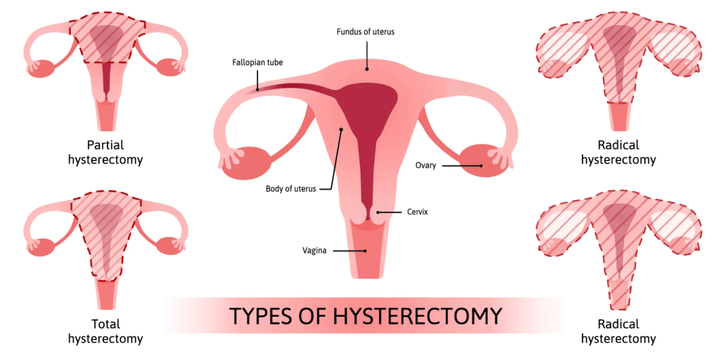 - Total or Simple Hysterectomy: The entire uterus and cervix are removed.