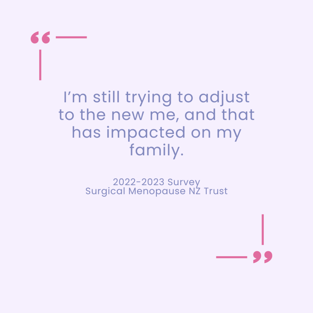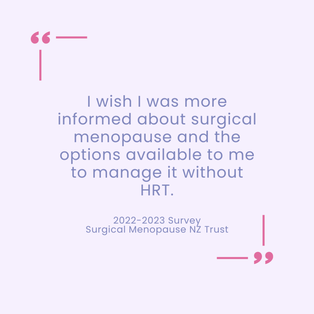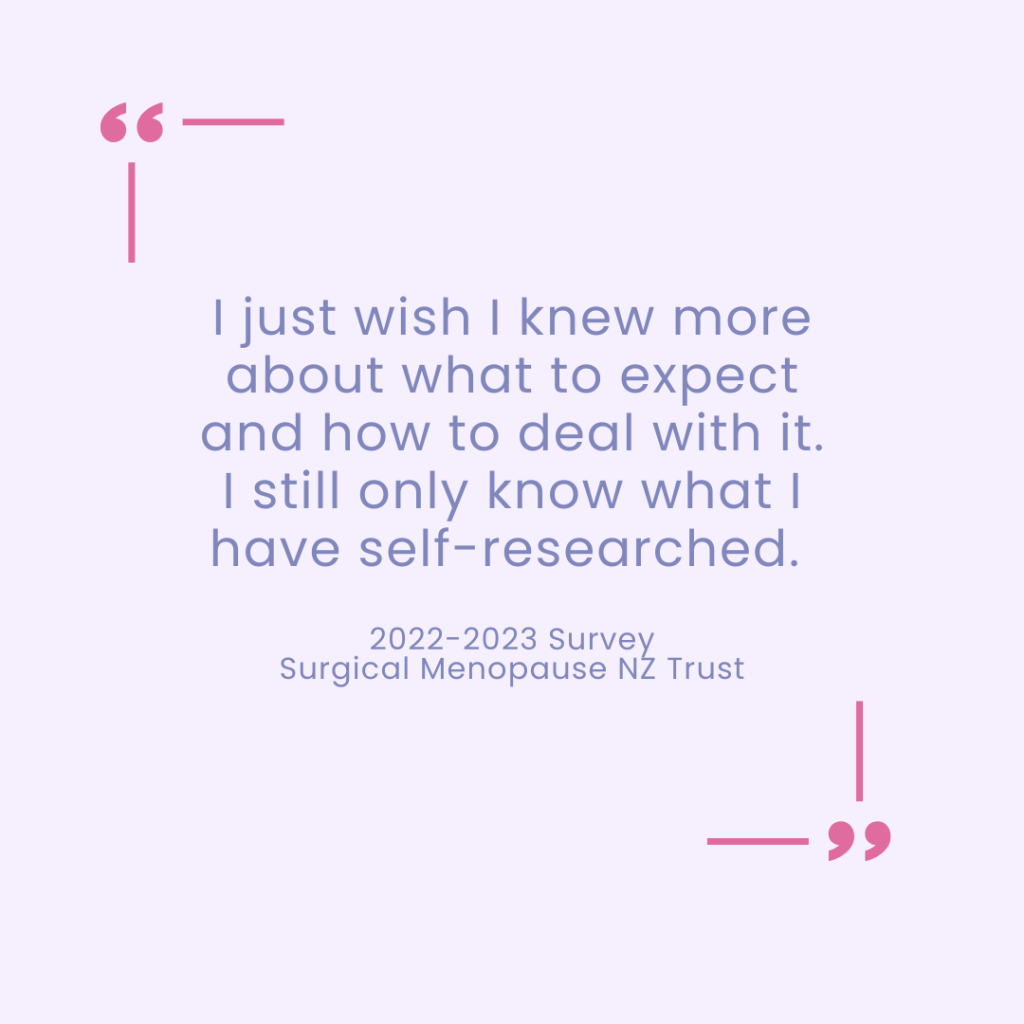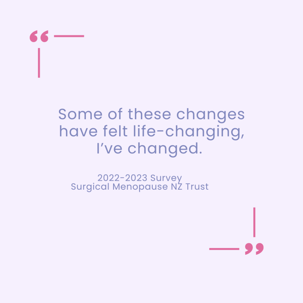 These quotes reflect the real experiences of women in Aotearoa New Zealand living with surgical menopause (Surgical Menopause NZ Trust, 2022–2023; Menodoctor, 2022–2023).