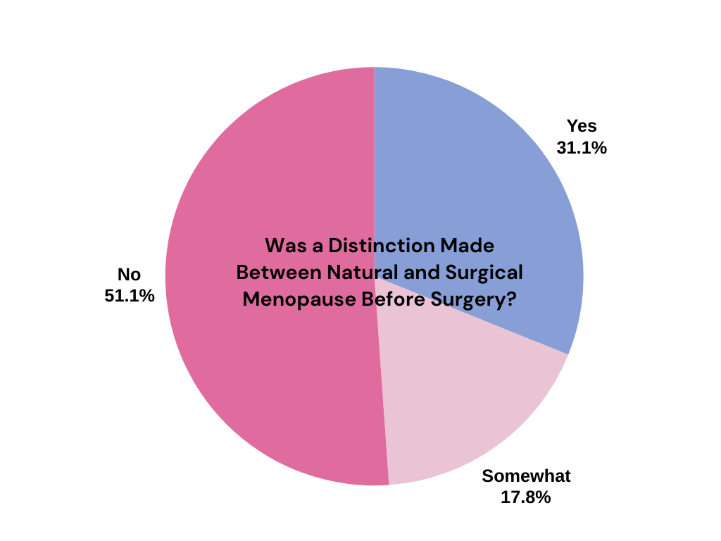 The distinction between natural and surgical menopause was not clearly communicated to 51% of respondents, revealing a significant gap in the pre-surgery education provided by healthcare professionals. This lack of clarity and support reinforces the necessity for women to advocate for thorough, clear, and personalised information regarding their treatment options and expected outcomes.