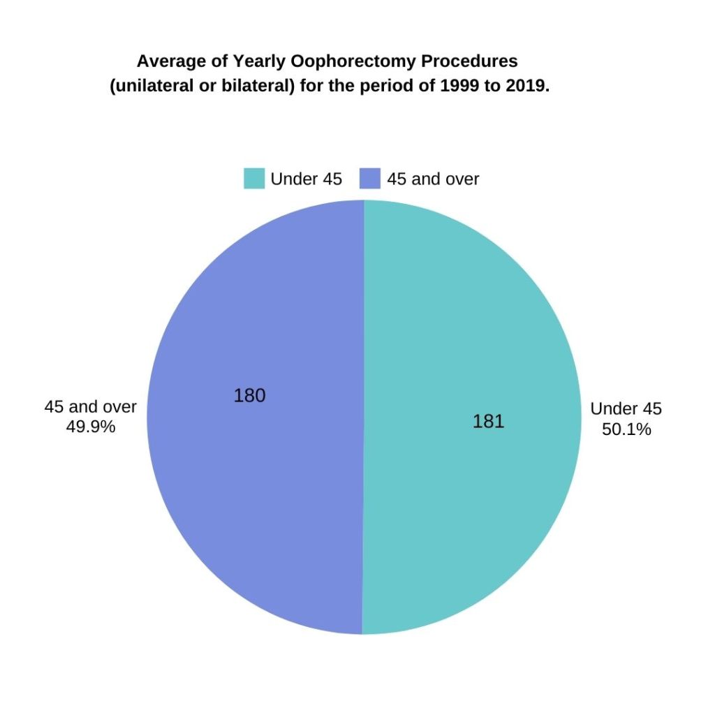 For independent oophorectomies, an average of 361 women underwent surgery annually, with 50% (around 181) under the age of 45.
