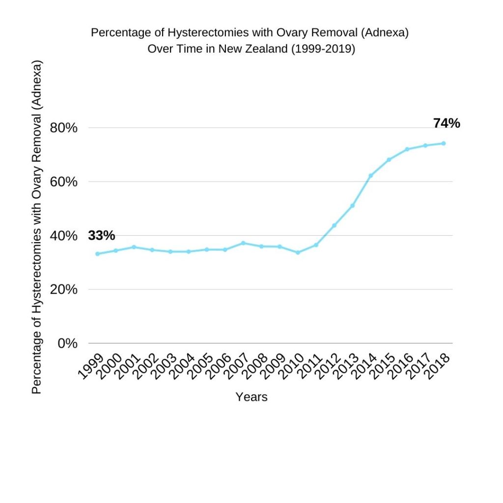 Over the two decades, public data indicates a significant evolution in surgical practices regarding hysterectomies in New Zealand. The total number of hysterectomies, with or without adnexa removal, has decreased from 3,423 in 1999/2000 to 2,987 in 2018/2019. Despite this decline, the proportion of hysterectomies that involve adnexa removal has risen, reflecting a more aggressive approach to cancer prevention, particularly concerning ovarian cancer, which ranks as the fifth most common cancer among women in the country and a leading cause of cancer-related deaths.