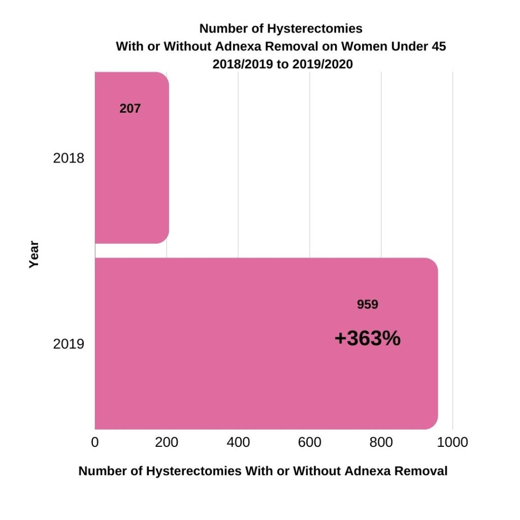 A sharp rise in hysterectomies occurred between 2018/2019 and 2019/2020 in the public sector, with a 363% increase in surgeries performed on women under 45.