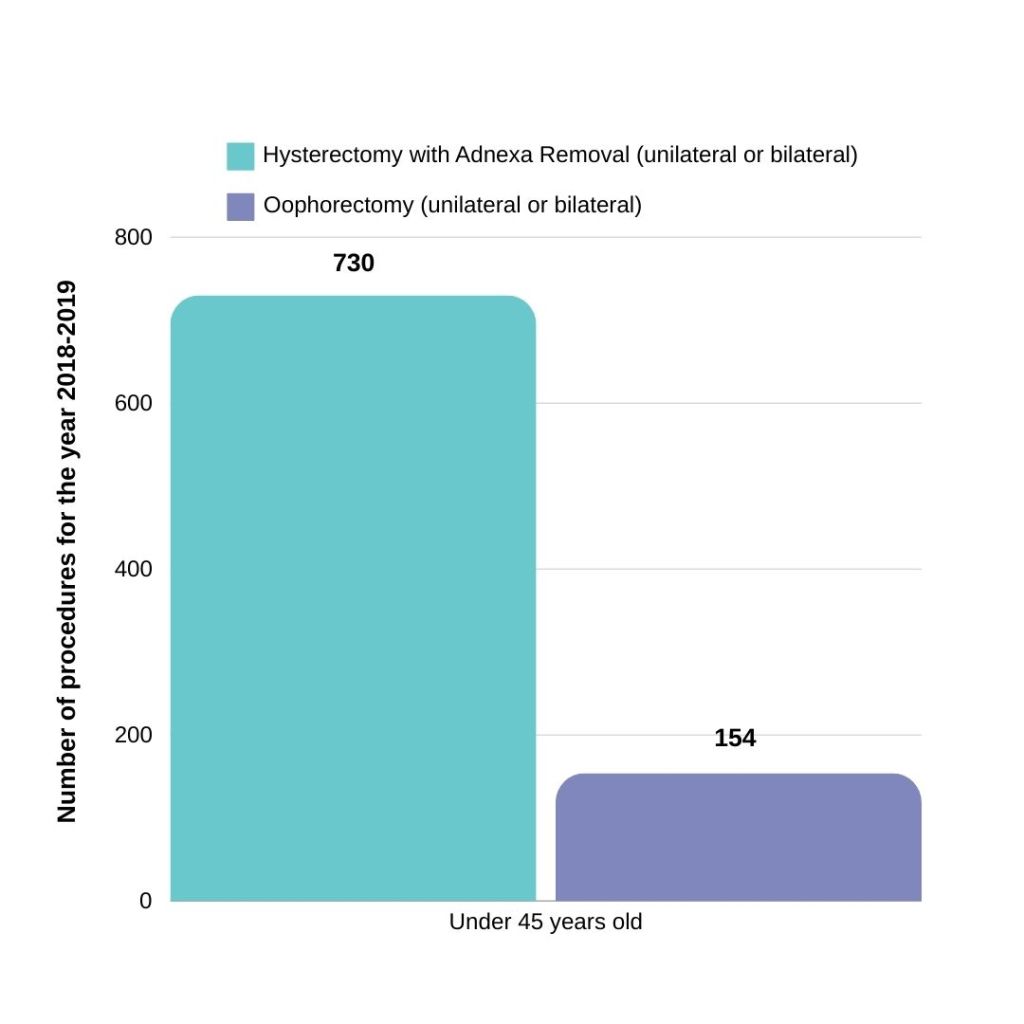 In 2018/2019, within the public sector only, 884 (35%) of the 2,501 combined gynaecological surgeries—including hysterectomies with the removal of one or both ovaries (or adnexa), as well as independent oophorectomies – were performed on women under 45. Notably, more than half of all independent oophorectomies were carried out on this younger demographic, emphasising the significant impact of these surgeries on women in their reproductive years.